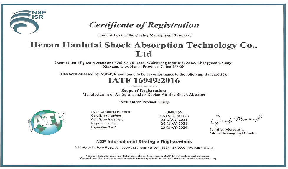 Air Bag Suspension systems. To obtain this certification, products must undergo rigorous testing, such as fatigue resistance tests (withstand millions of cycles of vibration without failure), damping performance tests (maintain stable damping force under different working conditions), and structural integrity inspections (prevent oil leakage, piston rod bending, or other faults).